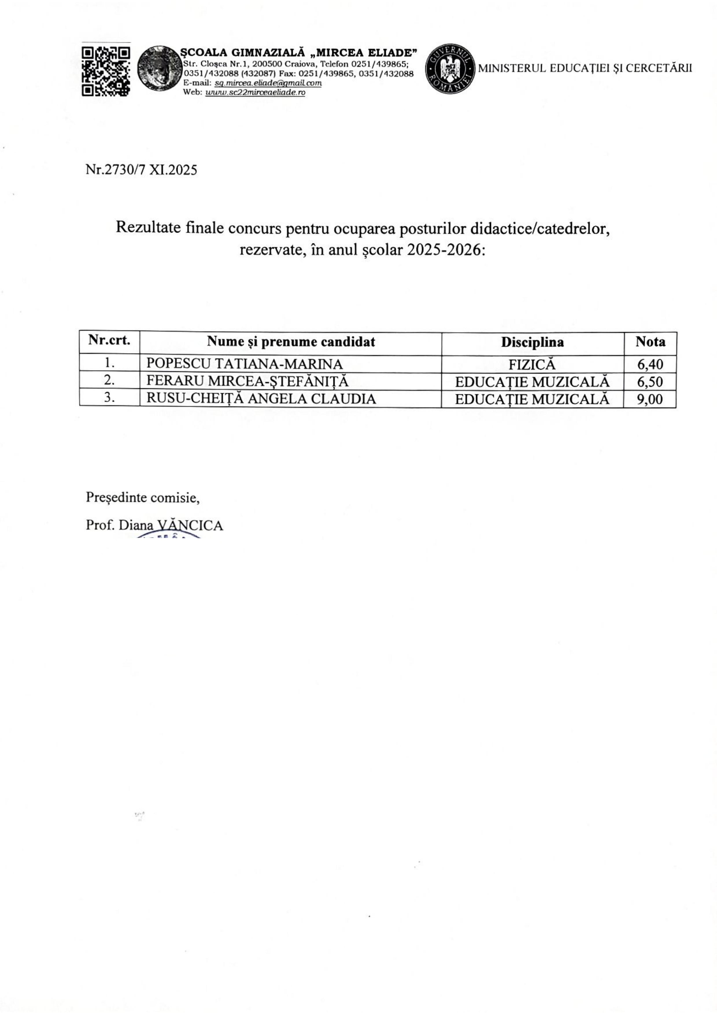 -Rezultate ROMÂNĂLista funcțiilor din Școala Gimnazială „Mircea Eliade” Craiova la data de 30 septembrie 2024Program pentru depunerea cererilor și dosarelor pentru etapa de pretransfer consimțit între unitățile de învățământ al personalului didactic de predare la secretariatul Școlii Gimnaziale ”Mircea Eliade” Program primirea dosarelor pentru etapa de transfer Lista posturi vacante/rezervateGrila Anexa 1 Pretransfer Decizie MRU Ordin privind completarea declaratiei de interese OME_3051 arhivă