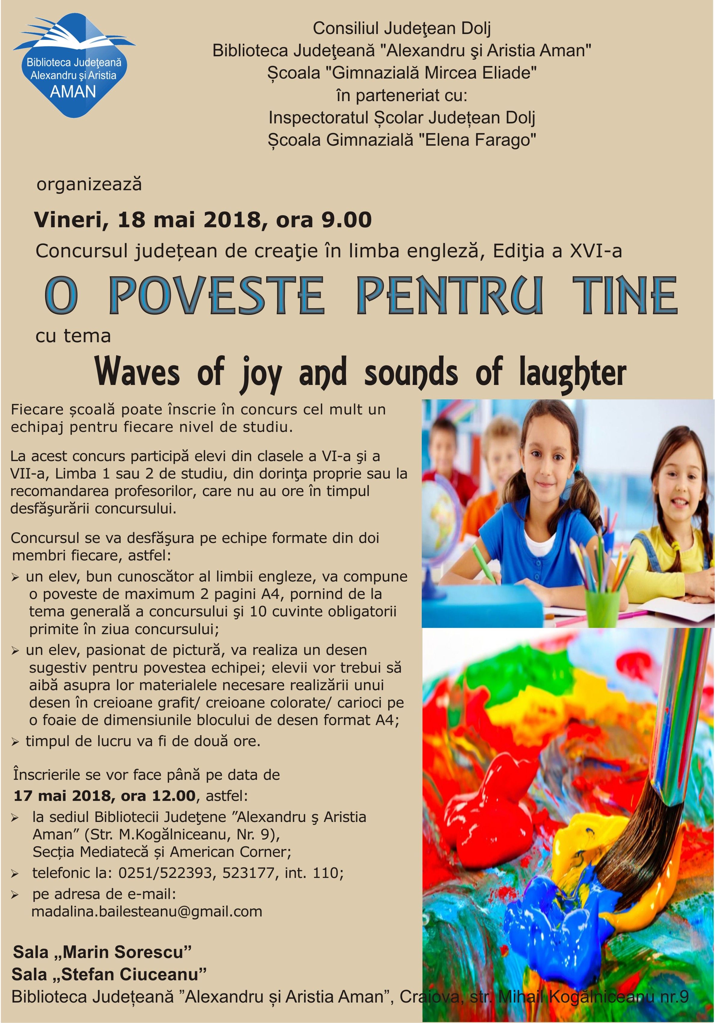 Concursul județean integrat "Craiova de ieri și de azi" editia a IX-a - regulamentConcursul interjudetean Elena Farago - regulamentConcursul interdisciplinar de matematica in limba engleza 22 METS - rezultateConcursul interdisciplinar de matematica in limba engleza 22 METS - subiecte, baremeOrganizarea si desfasurarea inscrierii in clasa pregatitoare, etapa a II-a, anul scolar 2017-2018.8 locuri disponibile dupa prima etapa. Concursul interdisciplinar de matematică în limba engleză '22METS' - invitatie si regulament Concursul local de creatie si traducere 'Marin Sorescu - Puterea cuvantului' - rezultateOlimpiada Limba Engleza, faza locala - rezultate10.03.2017